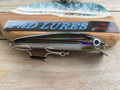 the Aluminium bib is designed to take the toughest of treatments. Weighing around 85grms it casts like a bullet. These lures are designed to mimic mullet on the surface. Will dive to around 4-6ft with a faster retrieve. Ideally it should be reeled with a slow retrieve to keep it close to the mullet school.